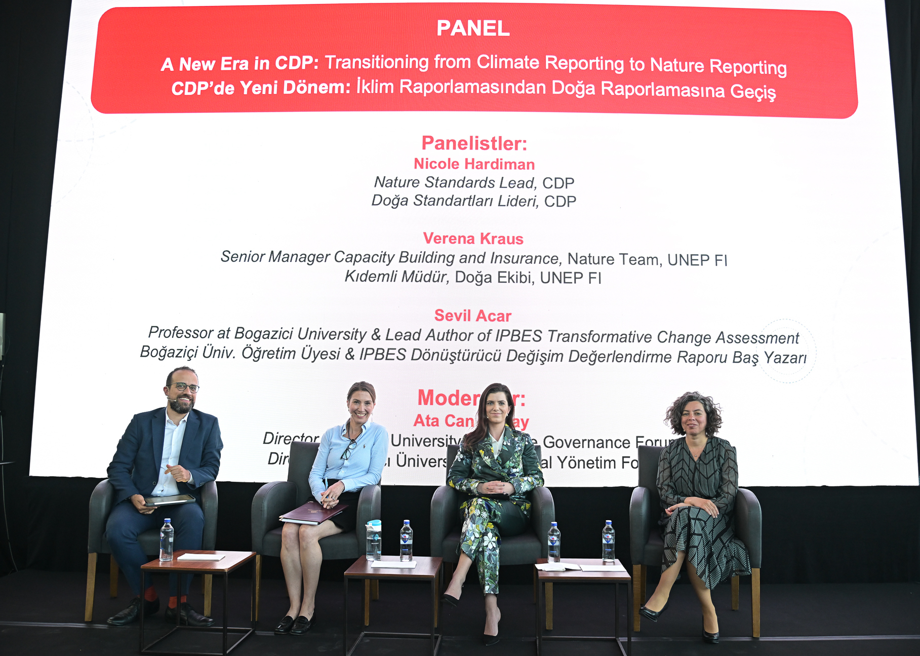 Konferans kapsamında düzenlenen “İklim Raporlamasından Doğa Raporlamasına Geçiş” başlıklı panelin moderatörlüğünü Sabancı Üniversitesi Kurumsal Yönetim Forumu Direktörü Ata Can Bertay yaptı. Panele; CDP Doğa Standartları Lideri Nicole Hardiman, Birleşmiş Milletler Çevre Programı Finans Girişimi (UNEP FI) Doğa Ekibi Kıdemli Müdürü Verena Kraus ve Boğaziçi Üniversitesi Öğretim Üyesi ve Biyoçeşitlilik ve Ekosistem Hizmetlerine İlişkin Hükümetler Arası Platform (IPBES) Dönüştürücü Değişim Değerlendirme Raporu Baş Yazarı Sevil Acar konuşmacı olarak katıldı.